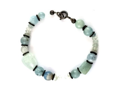 Bracelet monté sur câble, 18 cm, avec perles variées en aigue marine; intercalaires et fermoir anneau ressort en argent vieilli 925