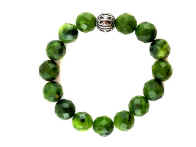 Bracelet monté sur élastique, 18 cm, avec perles variées de 12 mm facetté en jade néphrite; cache noeud en acier inoxydable argenté sculpté