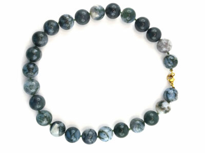 Montage sur fil avec noeud entre chaque perles, 42 cm, perles rondes de 16 mm; fermoir menotte plaqué or