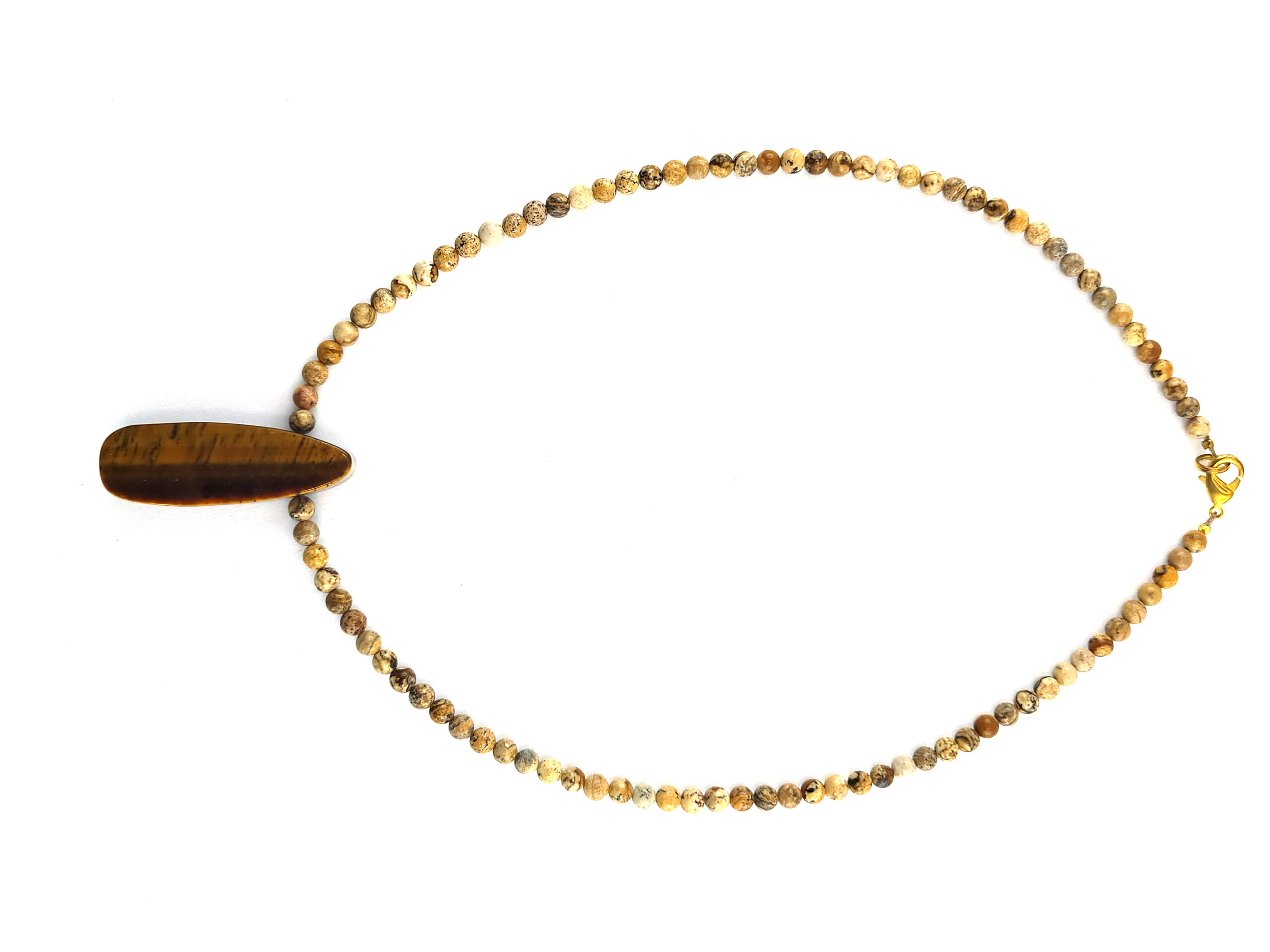 Montage sur câble 42 cm, avec perles en jaspe paysage de 4 mm; au centre motif goutte en oeil de tigre; fermoir menotte en métal doré