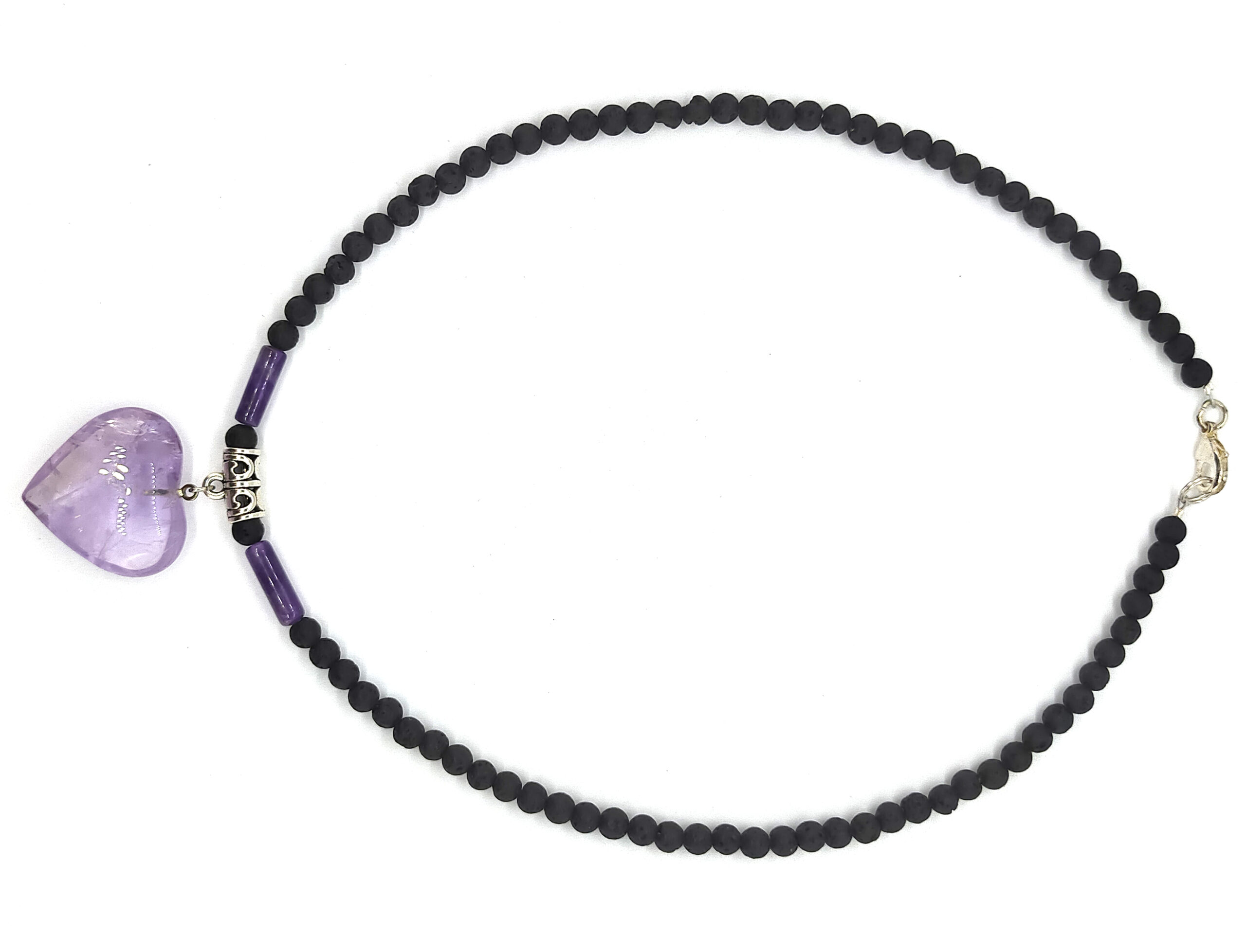 Montage sur câble, 40 cm , avec perles de 4mm en lave et centre coeur améthyste 25×25, fermoir menotte et porte pierre en métal argenté