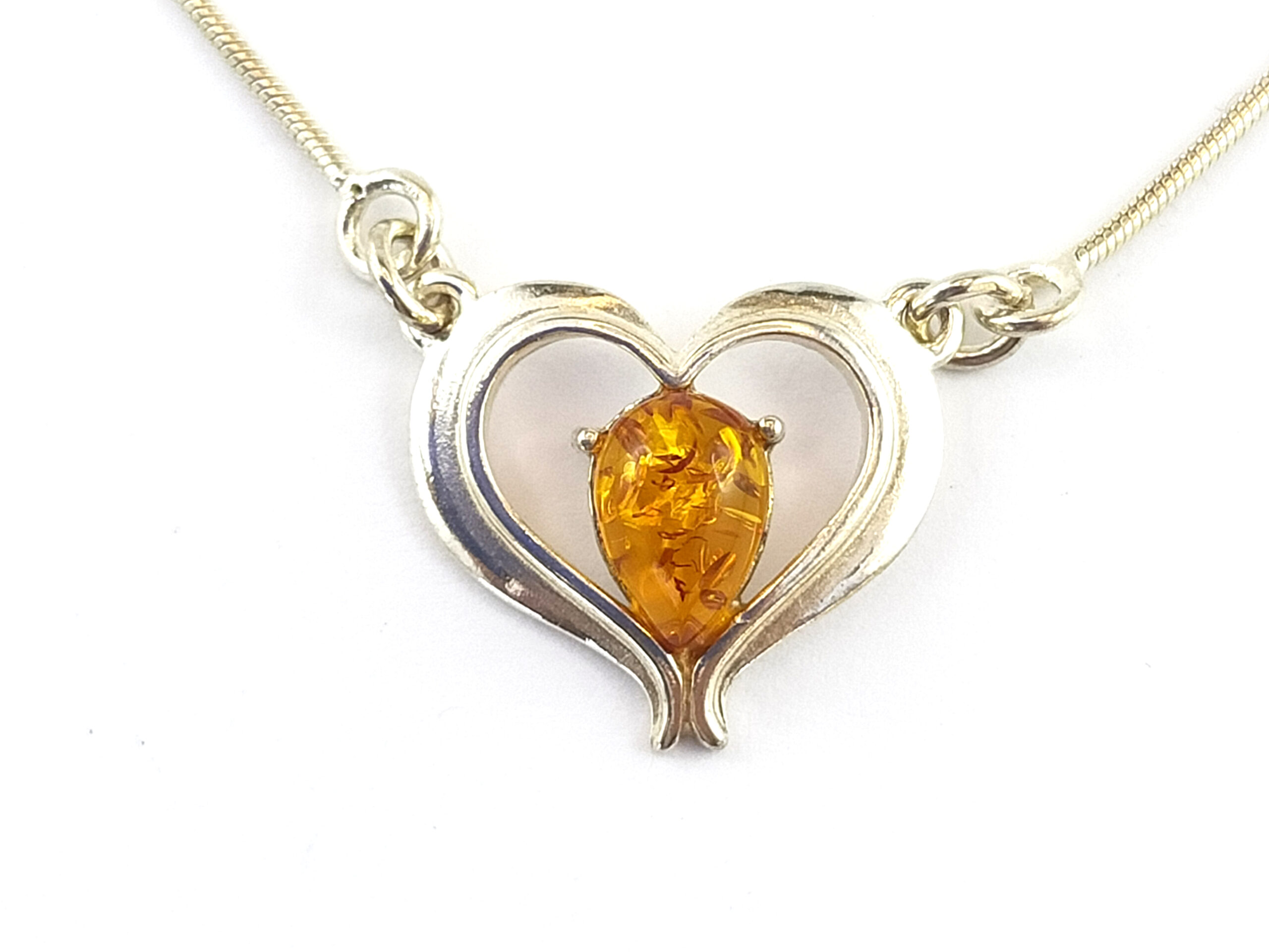 Chaîne pendentif en argent 925, d’un poids de 5,7 g, 42 cm, avec motif central coeur et cabochon poire 9×7 en ambre; fermoir menotte en argent