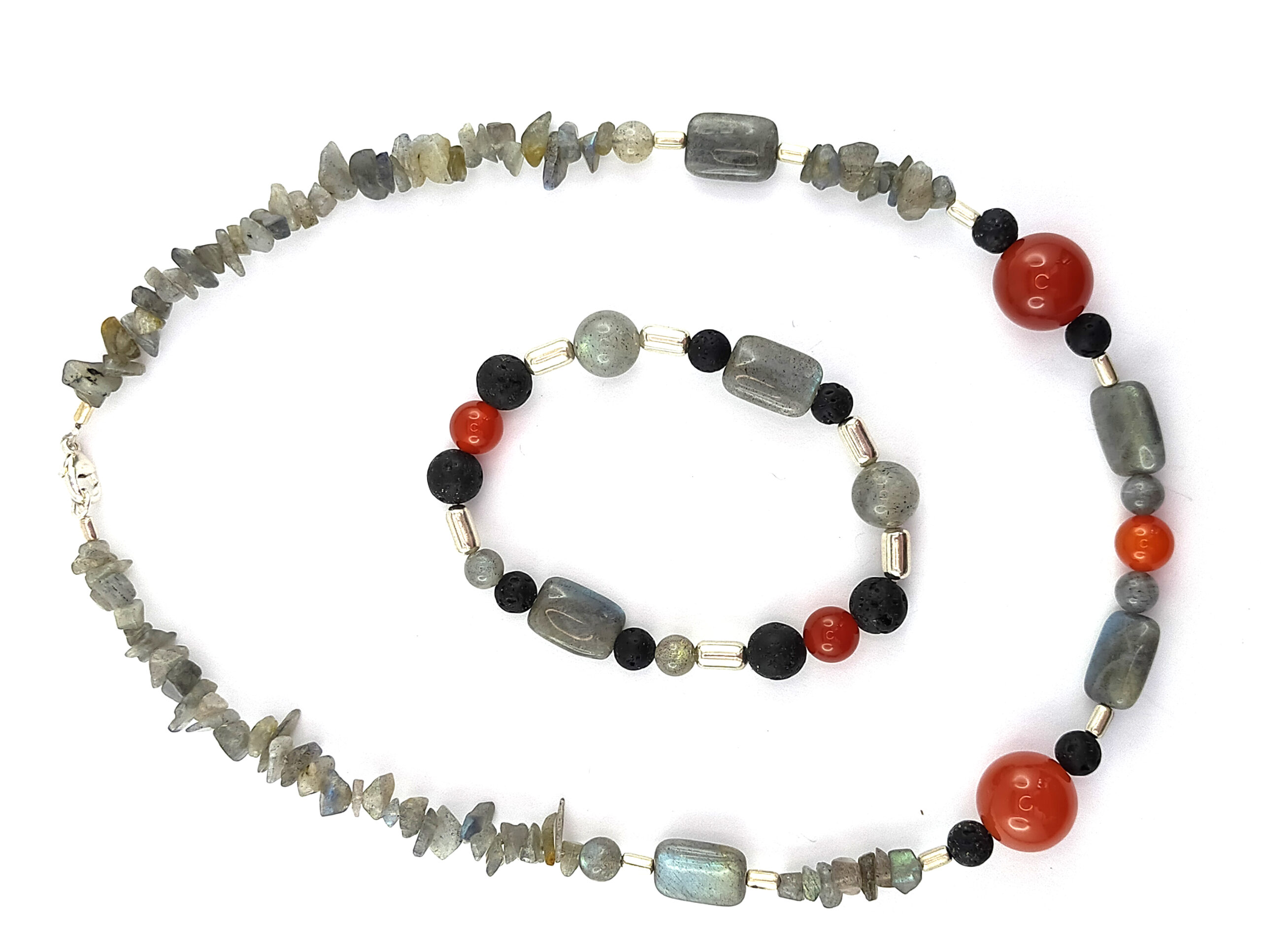 Collier monté sur câble, 42 cm, avec perles de labradorite variées, perles de lave 6 et 8 mm, perles de cornaline 8 et 14mm; intercalaires et fermoir menotte en argent 925