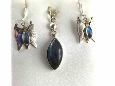 Parure en labradorite et argent 925 : pendentif et boucles d’oreilles