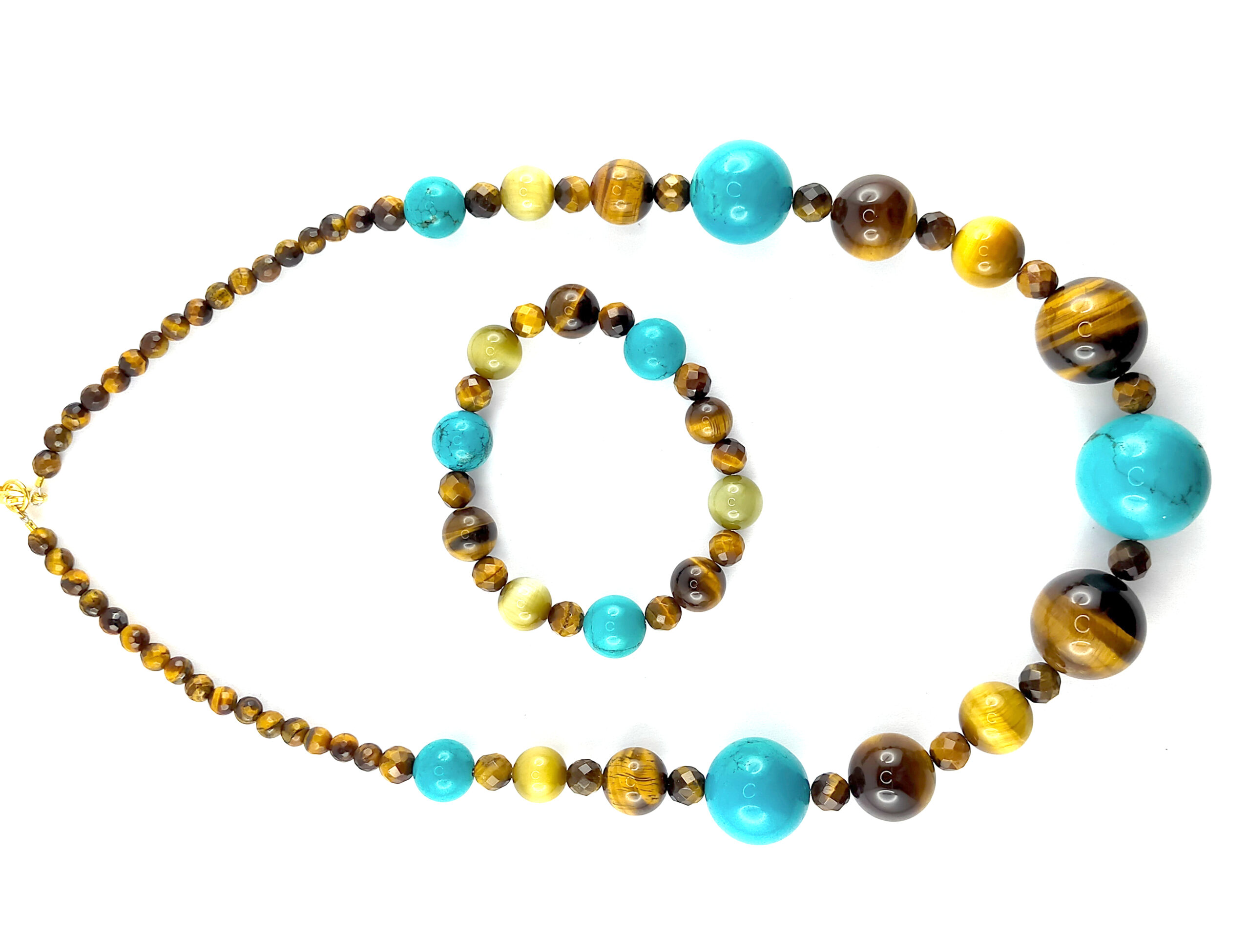 Parure fantaisie en oeil de tigre et turquoise (howlite colorée)