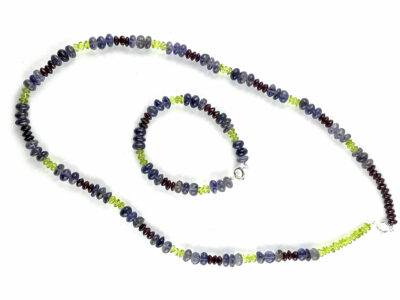 Parure collier et bracelet en grenat, péridot et cordiérite